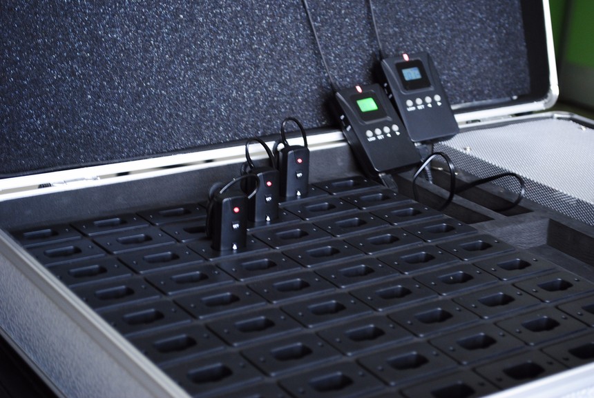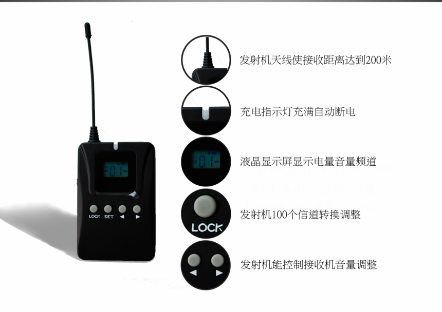 产品功能: 一对多讲解,一个主讲人进行讲解,多人佩戴蓝牙耳机接收设备进行内容听取 双通道讲解,两个主讲人可同时佩戴麦克风进行讲解,多人可佩戴蓝牙接收设备同时听取两人的讲解 产品优势: 1.设备小巧便于携带,样式多样满足不同场合需求 2.设备造型简约商务,适合各种正式非正式场合 3.设备自动跟随,反应灵敏,开机即用,无需任何人工操作 4.设备音质好,信号强,距离远,满足多种场合需求 5发射距离150米,U段频率,抗干扰能力强,高保真音质。小巧便携,自动组团无需任何操作。 使用场景: 景区景点参观讲解 博物馆展品参观讲解 学校讲堂 政府会议等讲解 国际会议同传讲解设备